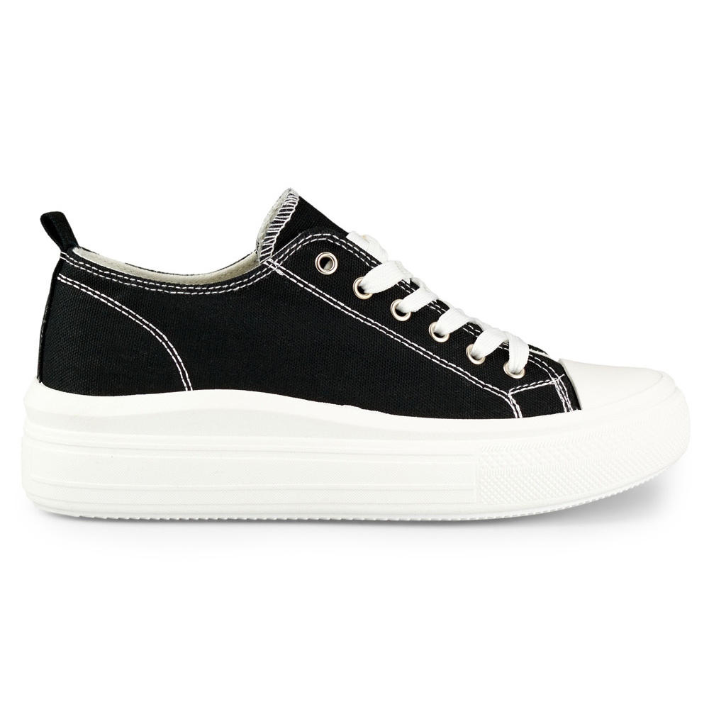 Detalles: Zapatillas negras en una plataforma baja. negro