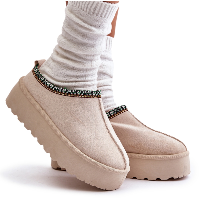 Ofrecemos zapatillas para mujeres de moda en la plataforma en un color beige claro, que son una combinación perfecta de comodidad con las últimas tendencias. La parte superior de la parte superior ha sido decorada con un bordado sutil, lo que les da un encanto único y femenino. La plataforma masiva en la que se resisten no solo garantiza un gran aislamiento del suelo frío, sino que también garantiza la estabilidad en cada paso.
