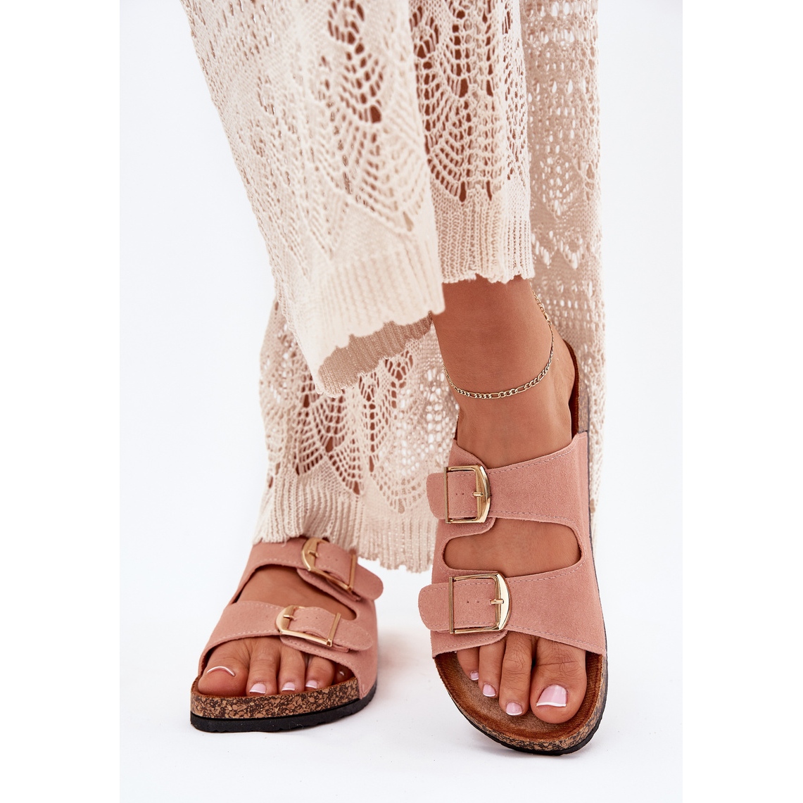 Zapatillas para mujeres en una plataforma de corcho con abrazaderas doradas rosa