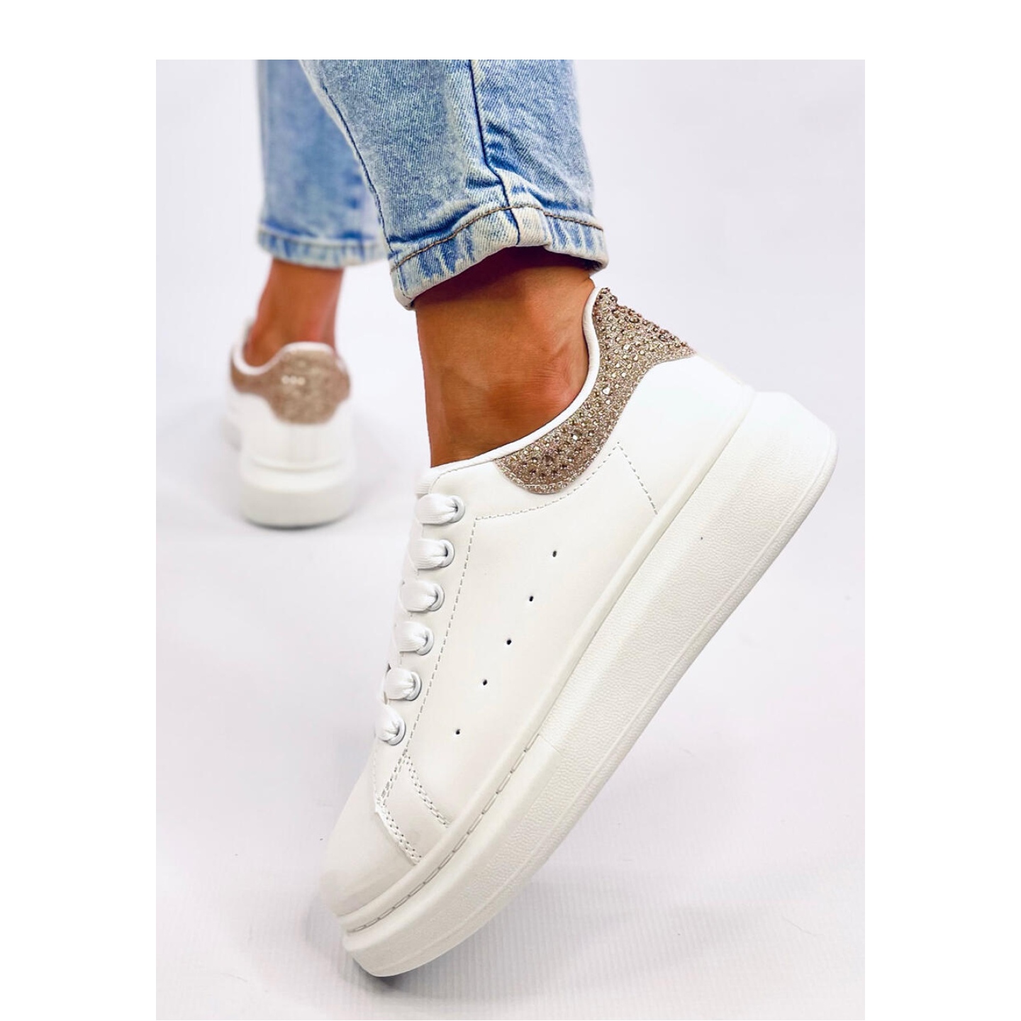 Pedir hoy las zapatillas blancas en la plataforma dorada y disfrute de un aspecto de moda que combina la holgura con elegancia. ¡No dudes, estas zapatillas son imprescindibles en el armario de cada mujer!