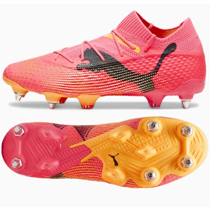El modelo Puma Future 7 Ultimate no solo se distingue por su funcionalidad, sino también por un aspecto de moda, que combina colores clásicos con un estilo moderno. Los elementos rosados enfatizan el personaje deportivo, y el sutil acento naranja completa el conjunto.