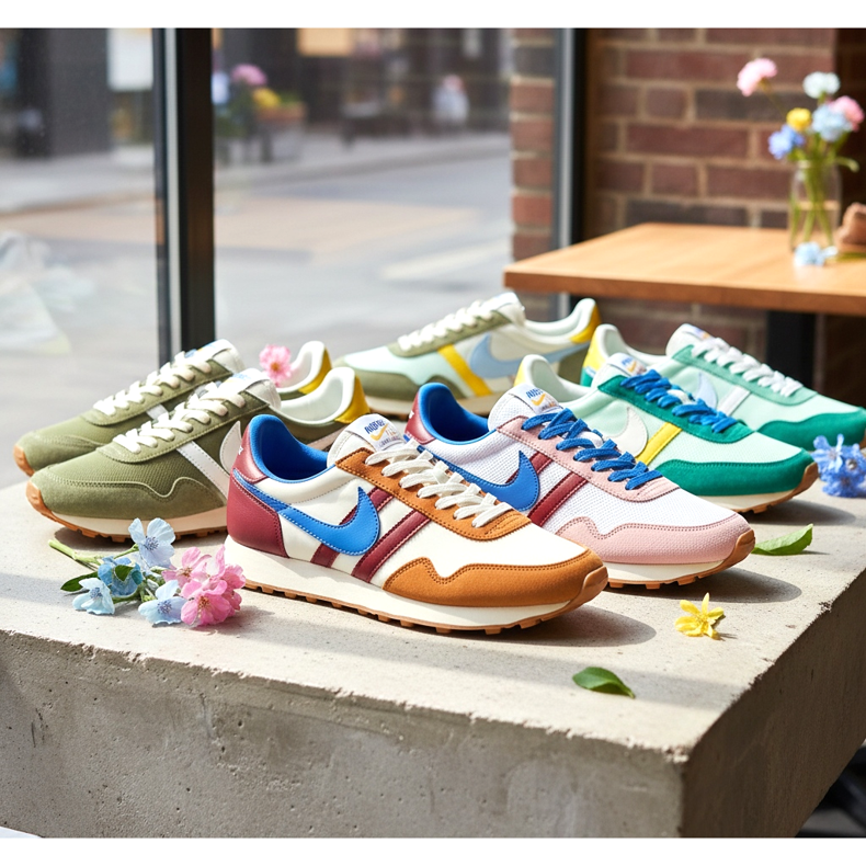 El Nike Cortez es otro ícono: un zapato creado para los Juegos Olímpicos de 1972 en Munich, con una silueta delgada distintiva y una parte superior de mosaicos coloridos. En 2026, Nike lo lanzará en nuevas versiones en colores pastel que se adaptan perfectamente al ambiente primaveral.