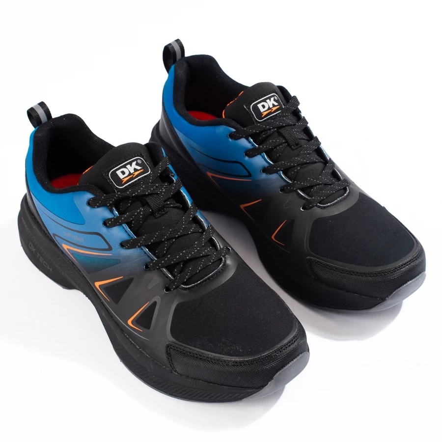 Los zapatos deportivos softshell para hombre de DK son el modelo perfecto para los amantes de un estilo de vida activo. Son negros con una sutil adición de azul. Los zapatos están fabricados en material 100% textil tanto por dentro como por fuera. Tienen un perfil bajo y no tienen tacón, lo que garantiza comodidad al usarlos.