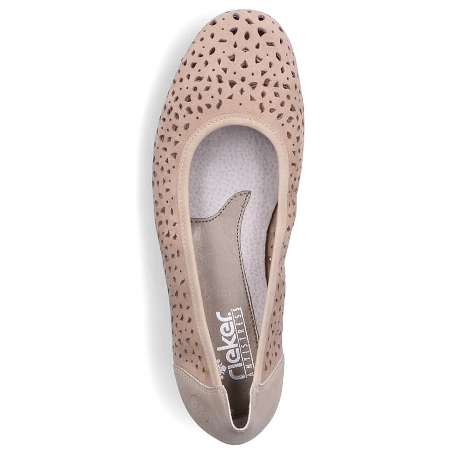Zapatos sin cordones únicos de cuero calado para mujer, beige Rieker L9365-61: ¡imprescindibles para toda mujer que valora el estilo y la comodidad!