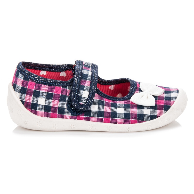 Encantadoras zapatillas infantiles de Reweks, diseñadas especialmente para niñas. El clásico patrón de cuadros con una combinación de detalles en azul marino y rosa hace que las pantuflas sean elegantes y amigables para los pies pequeños.