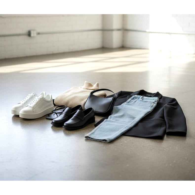 Enfoque minimalista: Zapatillas blancas o crema de los años 90 con jeans rectos o mom jeans y una camiseta ajustada. Sin adornos, líneas limpias, paleta de colores neutros. Es una apariencia que refleja plenamente el espíritu de la década del minimalismo.
