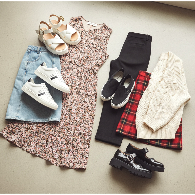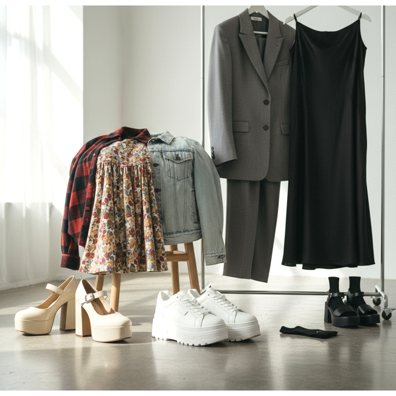 Mezclas antiguas: Vestidos babydoll con plataforma Mary Jane con estampado floral o de cuadros. Cubra con una chaqueta vaquera de gran tamaño o una camisa de franela que se pueda envolver alrededor de la cintura. El efecto es muy de los 90, pero con una interpretación contemporánea.