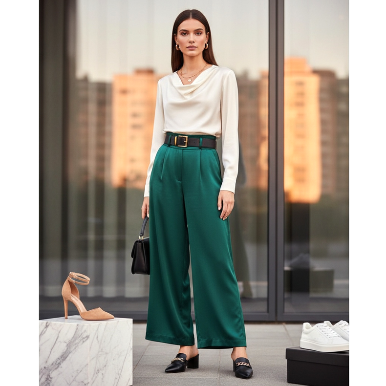 Al elegir el color de los zapatos para pantalones palazzo, conviene seguir algunas reglas básicas. Si quieres conseguir un efecto armonioso, elige zapatos de un color similar al tono de los pantalones. Los estilos monocromáticos siempre lucen elegantes y profesionales.