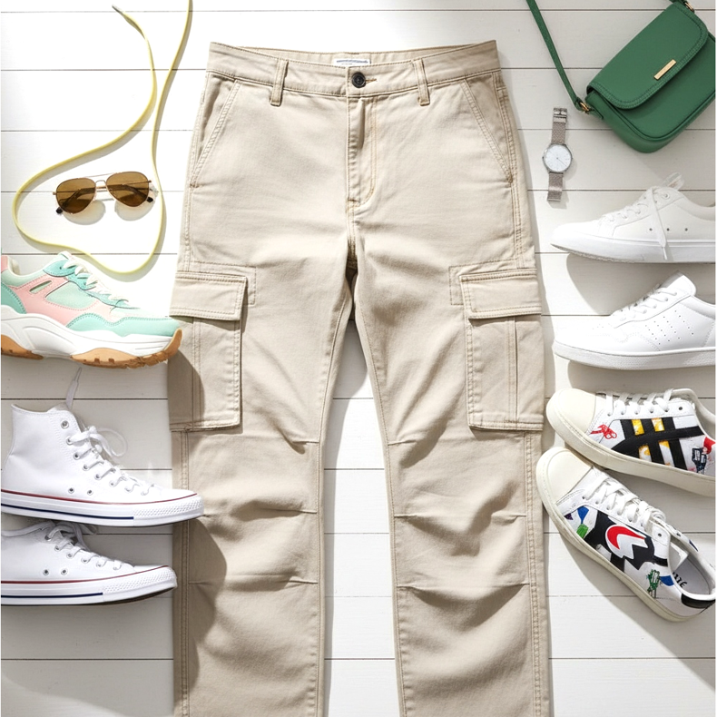 Si quieres añadir un poco de color a tu conjunto, puedes elegir zapatillas en tonos pastel: rosa, azul o verde. Estos zapatos tipo pantalón cargo son perfectos para la primavera y el verano, creando un look fresco y juvenil.