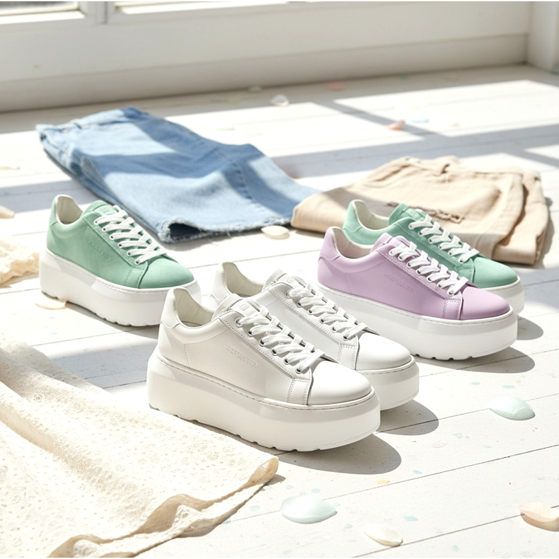 Los colores blanco y crema dominan, pero también aparecen cada vez con más frecuencia zapatillas de deporte con plataforma en tonos pastel: menta, rosa empolvado y lavanda. Esta es una excelente opción para las personas que buscan zapatos que sean a la vez modernos y expresivos.