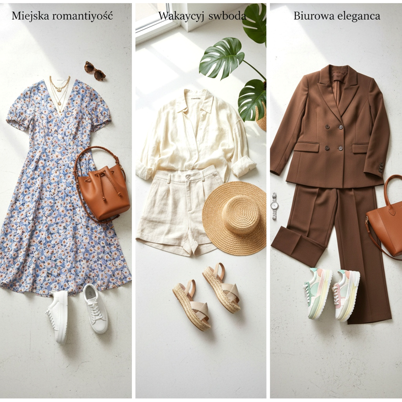 Look 1: Romanticismo urbano — vestido midi floral + zapatillas blancas con plataforma + bolso bombonera de piel marrón natural. Añade joyas delicadas y gafas de sol.