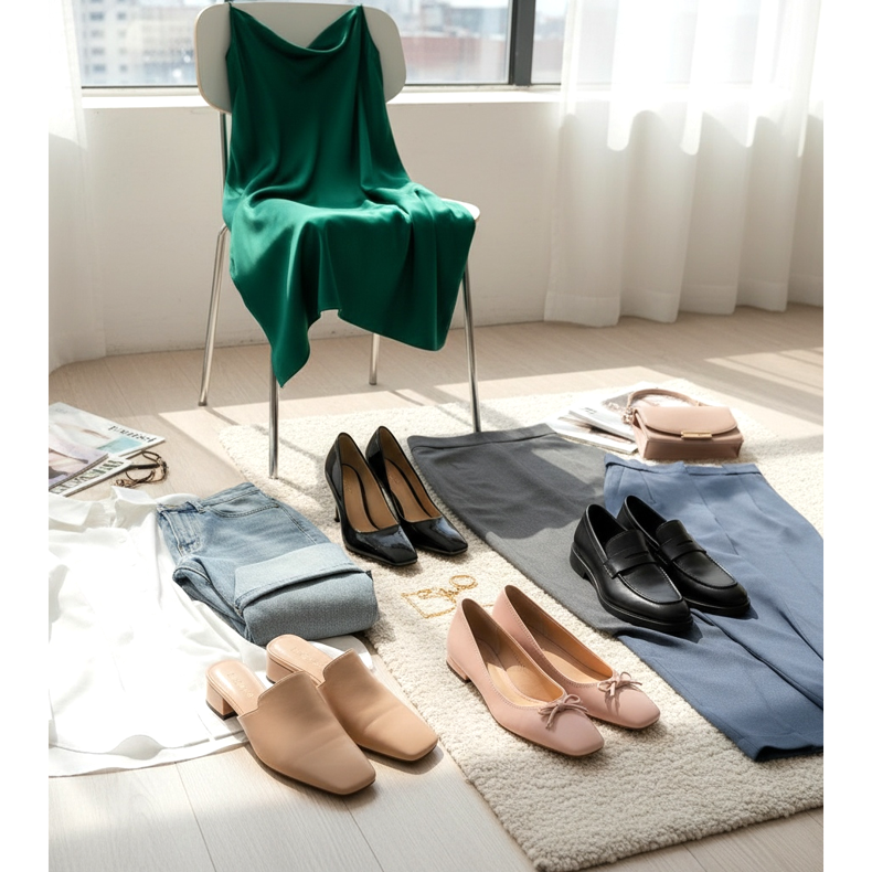 Para la oficina, combine bailarinas o mocasines de punta cuadrada con una falda de tubo o pantalones pitillo. Este conjunto es la quintaesencia del power log profesional de 2026. Elige un color de zapato similar a la parte inferior de tu conjunto para alargar ópticamente tus piernas.