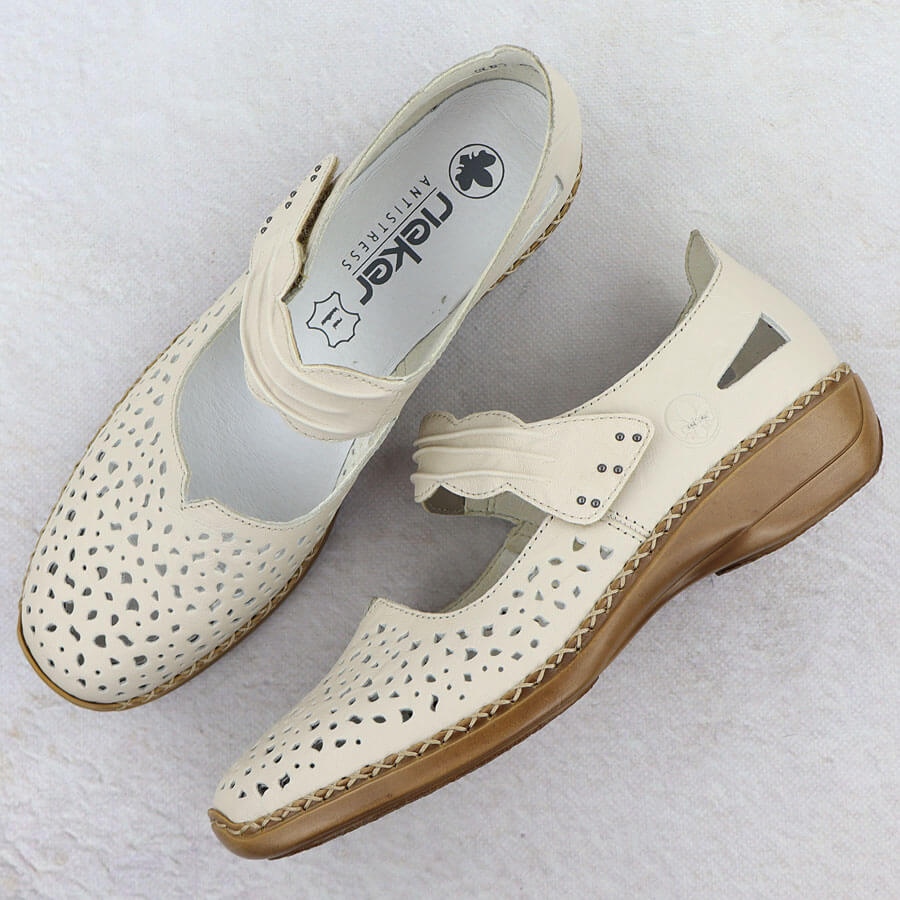 Detalles: Zapatos de cuero para mujeres con velcro beige rieker 41399-14