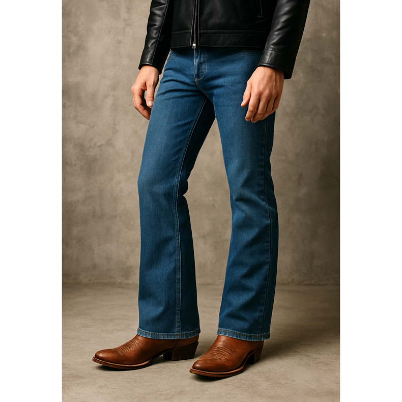 Los jeans bootcut y flare se caracterizan por una extensión desde la rodilla hacia abajo, creados especialmente para zapatos de caña alta. Los que mejor se adaptan son: botas de vaquero (botas occidentales), botas Chelsea, botas tipo jodhpur, botas de trabajo y botas altas con cordones. Las piernas deben cubrir la parte superior, cayendo ligeramente sobre el zapato. Evite las zapatillas bajas: lucirán perdidas debajo de pantalones anchos. Los jeans oscuros con corte de bota con botas Chelsea negras y una chaqueta de cuero son un look rockero. Los pantalones de campana brillantes con botas de vaquero marrones le dan al estilo un aire boho-country. Este corte de jeans ha vuelto a estar de moda en la moda masculina moderna.