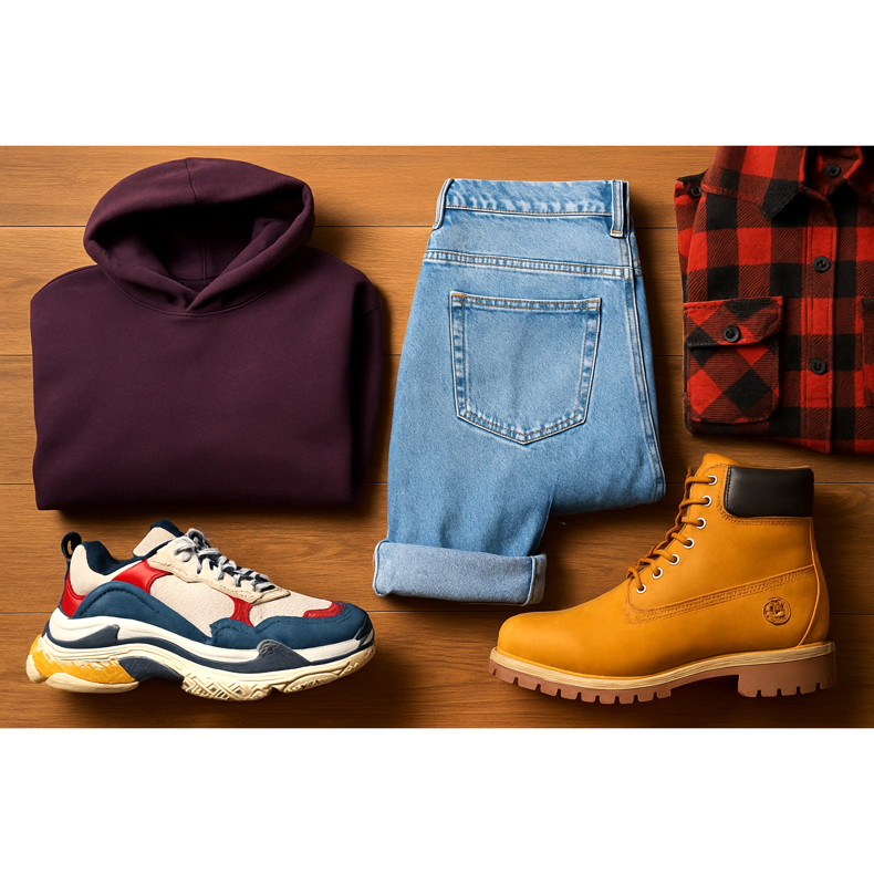 Los jeans holgados, de corte relajado o de estilo carpintero requieren un calzado más voluminoso que equilibre una silueta amplia. Perfecto serán: zapatillas gruesas (Balenciaga Triple S, Nike Air Max), botas altas, Dr. Martens, botas Timberland, botas de trabajo, botas de combate, zapatos gruesos para andar en patineta. El calzado demasiado delicado se perderá bajo las piernas anchas. Enrollar las piernas hace que el estilo parezca más intencionado. Look streetwear: jeans oversize + zapatillas gruesas + sudadera con capucha oversize. Estilo de ropa de trabajo: jeans carpintero + pantalón Timberland + camisa de franela.