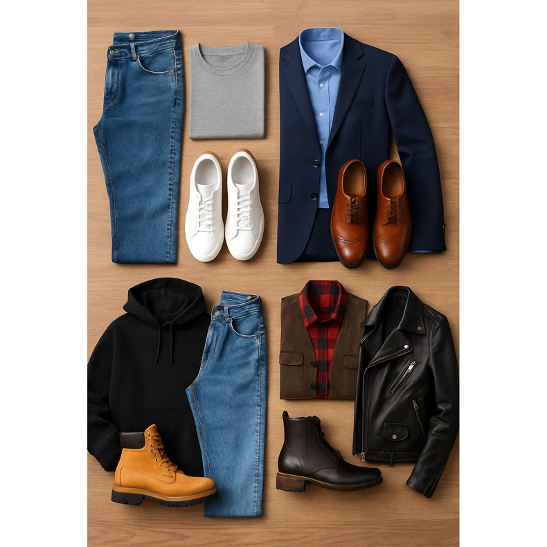 El estilo casual: jeans + zapatillas o mocasines + camiseta o polo es un clásico de todos los días del fin de semana. Casual elegante: jeans oscuros + brogue o derby marrón + camisa + chaqueta: estilo para el trabajo con un código de vestimenta holgado o para eventos menos formales. Ropa de calle: jeans holgados + botas altas o zapatillas gruesas + sudadera oversize: estilo urbano y juvenil. Ropa de trabajo: vaqueros rectos + botas de trabajo + camisa de franela + chaleco, inspirado en la estética de la clase trabajadora. Rock/biker: jeans negros + botas Chelsea o cowboys + chaqueta de cuero: un clásico del rock. Cada estilo requiere una combinación adecuada del corte de los jeans y el tipo de calzado.