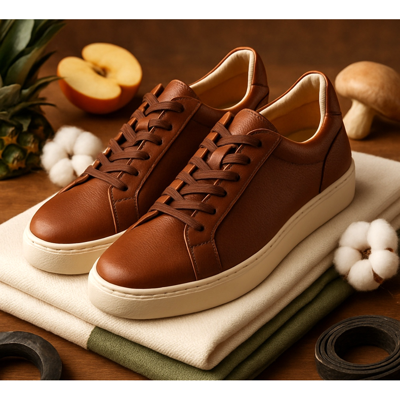 - Cuero vegano: Alternativas de origen vegetal (Piñatex de piña, Cuero de champiñones de champiñones, Cuero de manzana de manzanas)