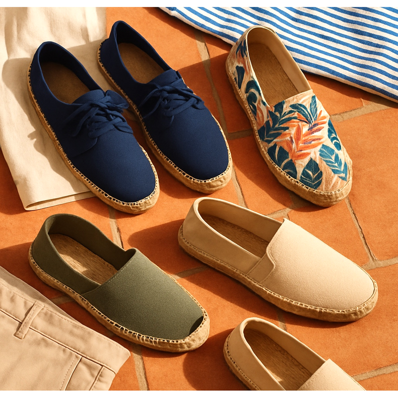 Las alpargatas son un calzado icónico del verano confeccionado en lona o lino con una característica suela de yute trenzada. Luminoso, aireado, perfecto para climas cálidos. Disponibles sin cordones (con o sin tacón), con cordones o con banda elástica. Colores: beige clásico, azul marino, caqui y estampados y estampados más atrevidos. Combinan perfectamente con pantalones cortos, pantalones de lino y chinos en un estilo informal de verano. También han ganado popularidad las alpargatas tipo zapatillas con una suela de goma más gruesa: son más universales y cómodas. Menos: la suela hecha de materiales naturales no es impermeable y no es apta para la lluvia. Las alpargatas simbolizan la relajación mediterránea y el estilo de vida vacacional.