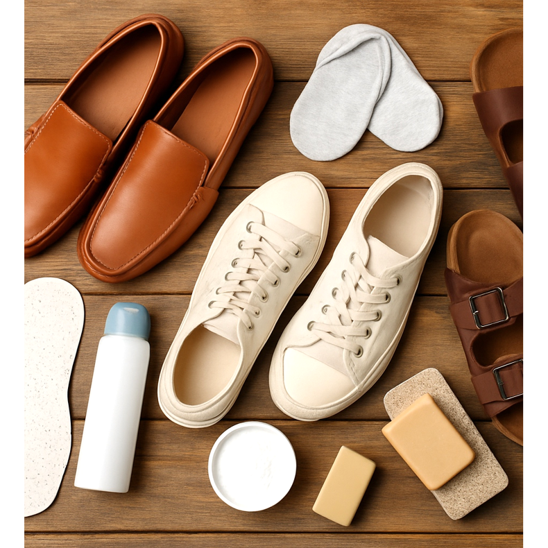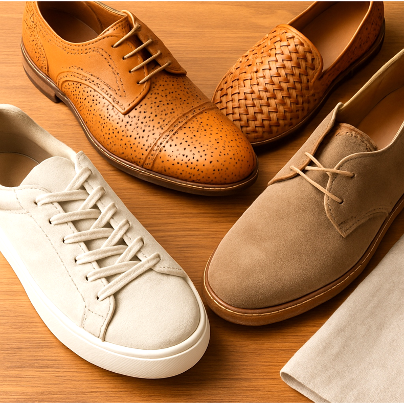 El cuero perforado (broches, perforaciones) no sólo añade carácter a los zapatos, sino que también mejora la ventilación. Los zapatos Oxford, derbis y mocasines perforados son una excelente opción de verano para estilos más formales. El ante y el nobuck son más aireados que el charol liso: las zapatillas de ante o las botas safari funcionarán bien en climas cálidos. El forro ligero de lino o algodón en lugar de sintético mejora el confort térmico. Los modelos con laterales abiertos (piel tejida) combinan la elegancia del cuero con la ventilación de las sandalias. Una suela de caucho natural o corcho es más ligera y aireada que una sintética pesada. Los colores claros de los zapatos (beige, tostado, blanco, gris claro) reflejan la luz del sol y no calientan tanto como los oscuros.