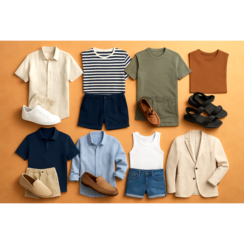 Zapatillas blancas + pantalón de lino + camisa de lino = elegancia informal clásica del verano. Alpargatas + pantalón chino + polo = look de vacaciones mediterráneo. Sandalias deportivas + shorts cargo + camiseta = estilo verano outdoor. Mocasines de ante + chinos remangados + camisa con mangas remangadas = smart casual para los días cálidos. Náuticos + pantalón corto blanco o azul marino + camiseta de rayas = aire náutico. Zapatillas de lona + shorts vaqueros + camiseta sin mangas = streetwear urbano. Mocasines ligeros + pantalones de lino + chaqueta de lino = informal de negocios de verano. Recuerde combinar su calzado con la ocasión: las sandalias no son apropiadas para la mayoría de los entornos de trabajo, ni siquiera en verano.