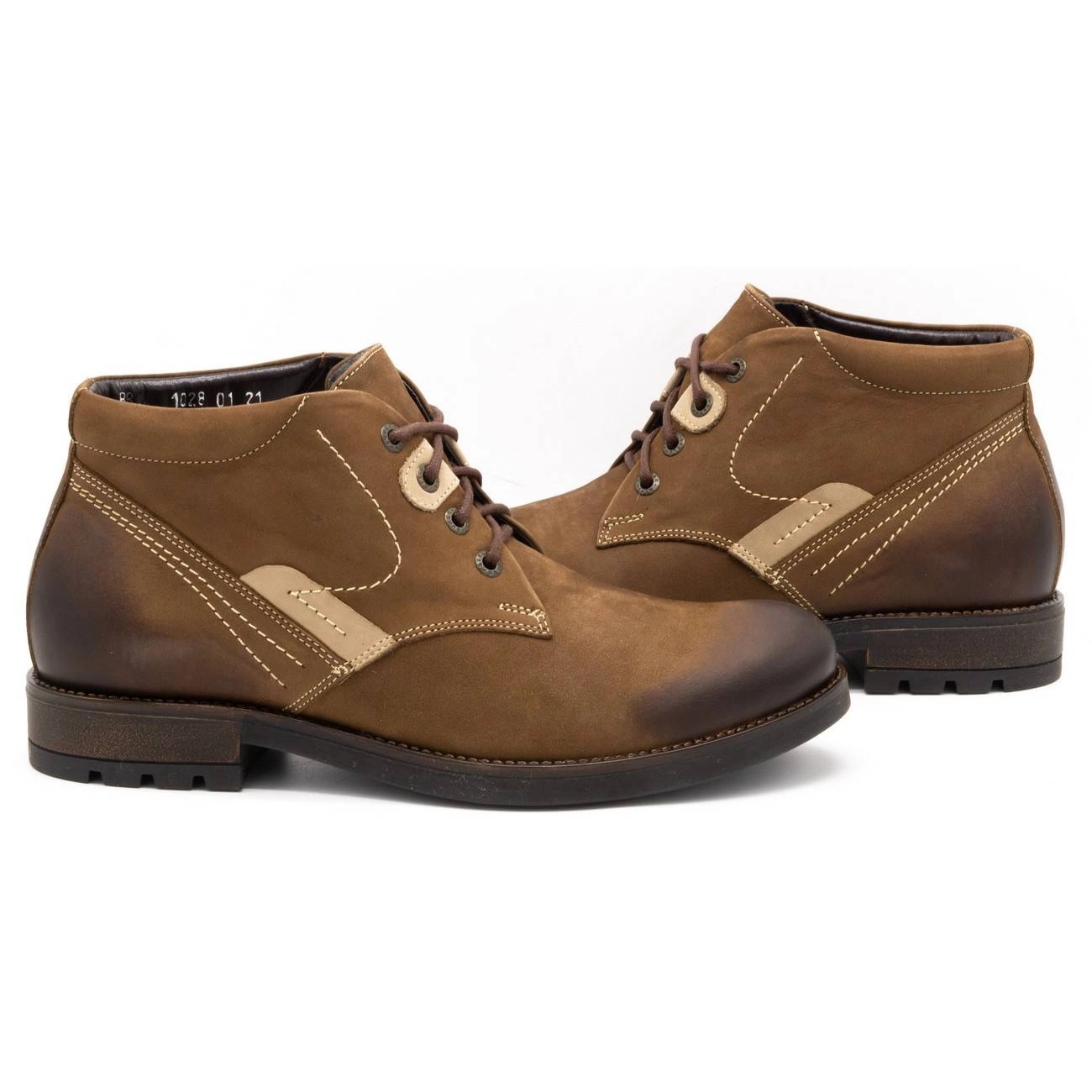 El producto son unos zapatos de invierno marrones para hombre de la marca Olivier. Estaban hechos de cuero natural de alta calidad. Estos zapatos tienen una parte superior que llega hasta el tobillo, se abrochan con cordones y están decorados con costuras brillantes. Hay abrasiones más oscuras en las puntas redondeadas y en el talón incorporado.