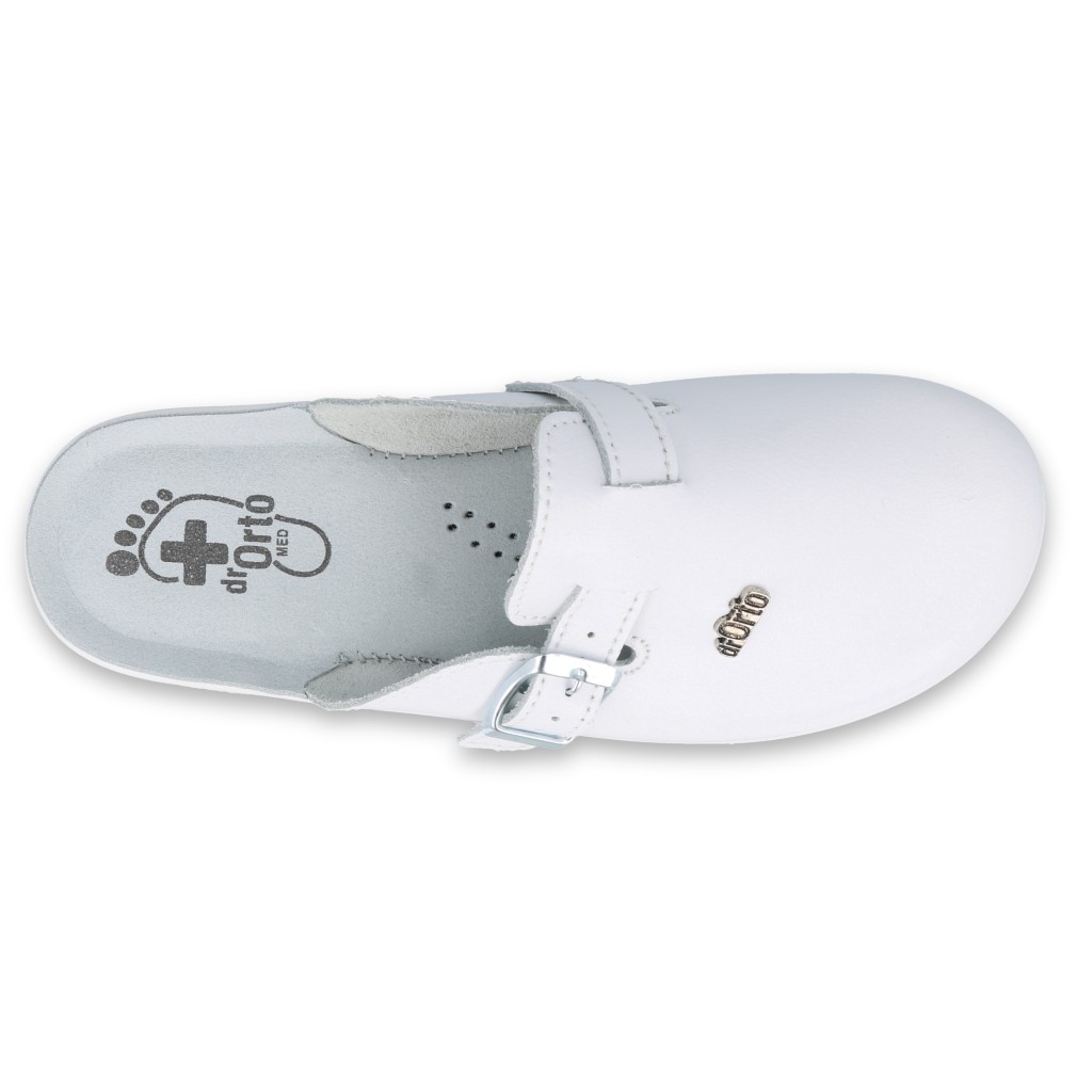 El producto son babuchas blancas de mujer de Befado, modelo 157D003. Recomendado especialmente para personas que trabajan en el servicio de salud, el calzado pertenece a la línea Dr Orto Med, cuyo objetivo es la profilaxis de la salud del pie. Las pantuflas están diseñadas para proteger los pies y prevenir dolencias que a menudo se producen como consecuencia de estar de pie durante mucho tiempo o de caminar intensamente. Están fabricadas en piel natural tanto en el exterior como en algunas de las plantillas. La suela, sin embargo, está hecha de materiales sintéticos.
