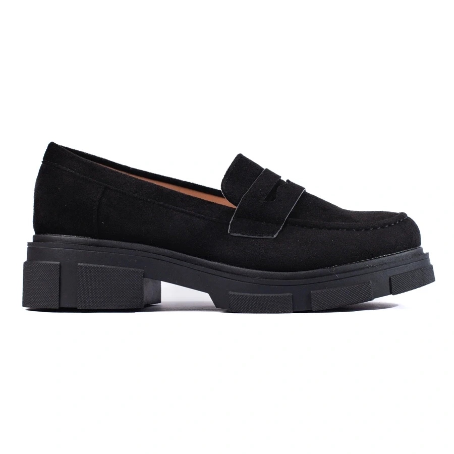 Elegantes y cómodos zapatos negros hechos de gamuza ecológica. Un corte clásico e informal de mocasines con una nariz completa y redonda, un abrochamiento suave y suave y un cómodo inserto de cuero ecológico. Perfecto para una base diaria: para el trabajo, para caminar y para estilizaciones urbanas.