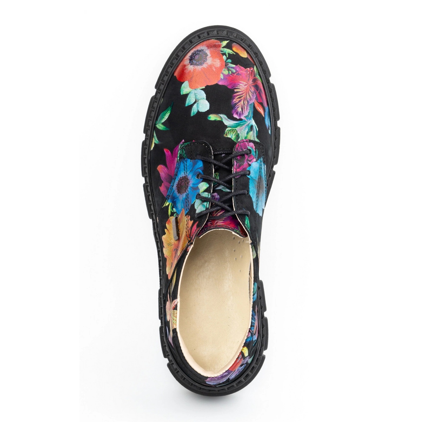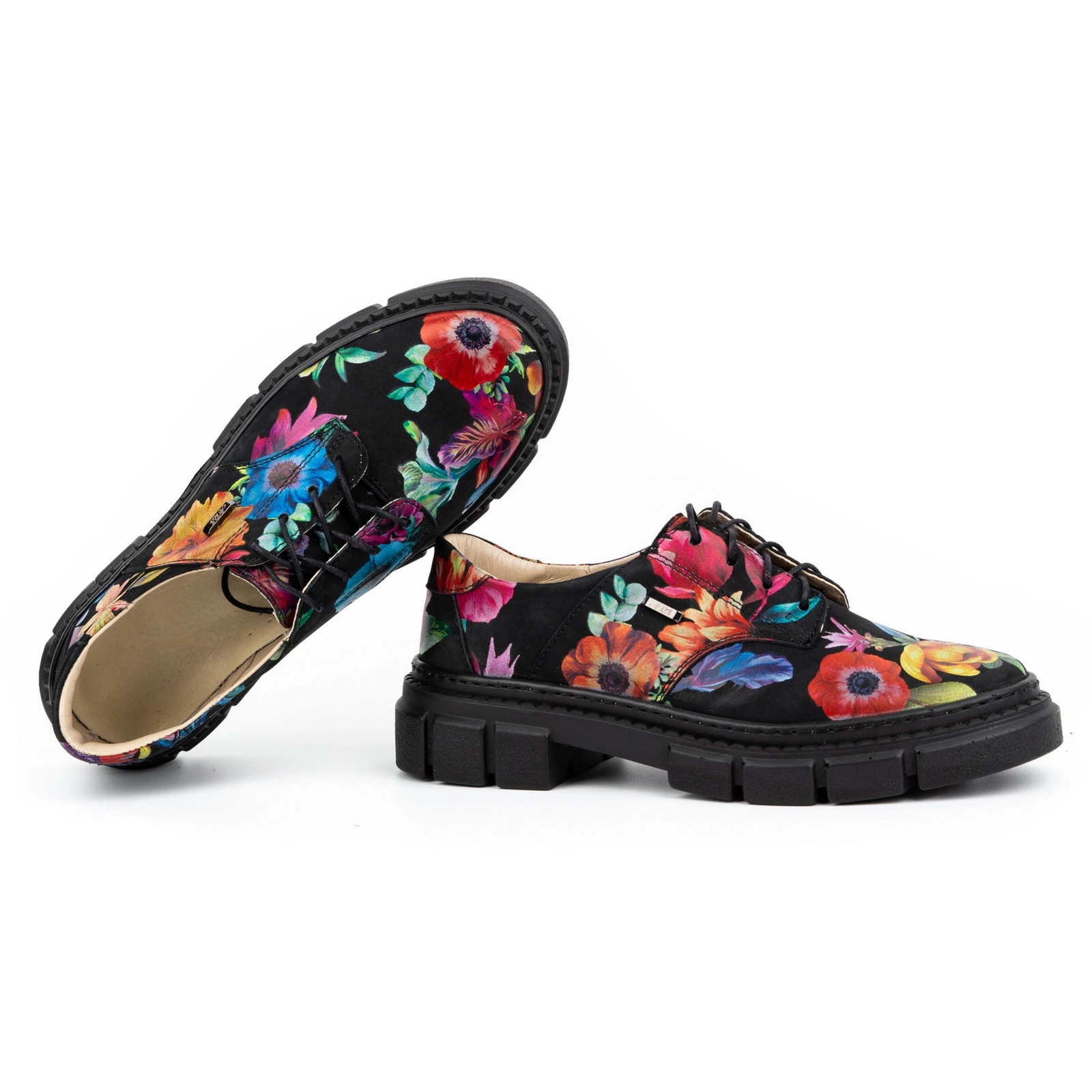 El producto está disponible en negro con estampado floral multicolor. El código del fabricante es BM178410. Estos zapatos están fabricados íntegramente en Polonia y se abrochan con cordones. La altura del tacón es de 3,5 cm. El producto pesa 0,7 kg y se entrega en el embalaje original del fabricante.