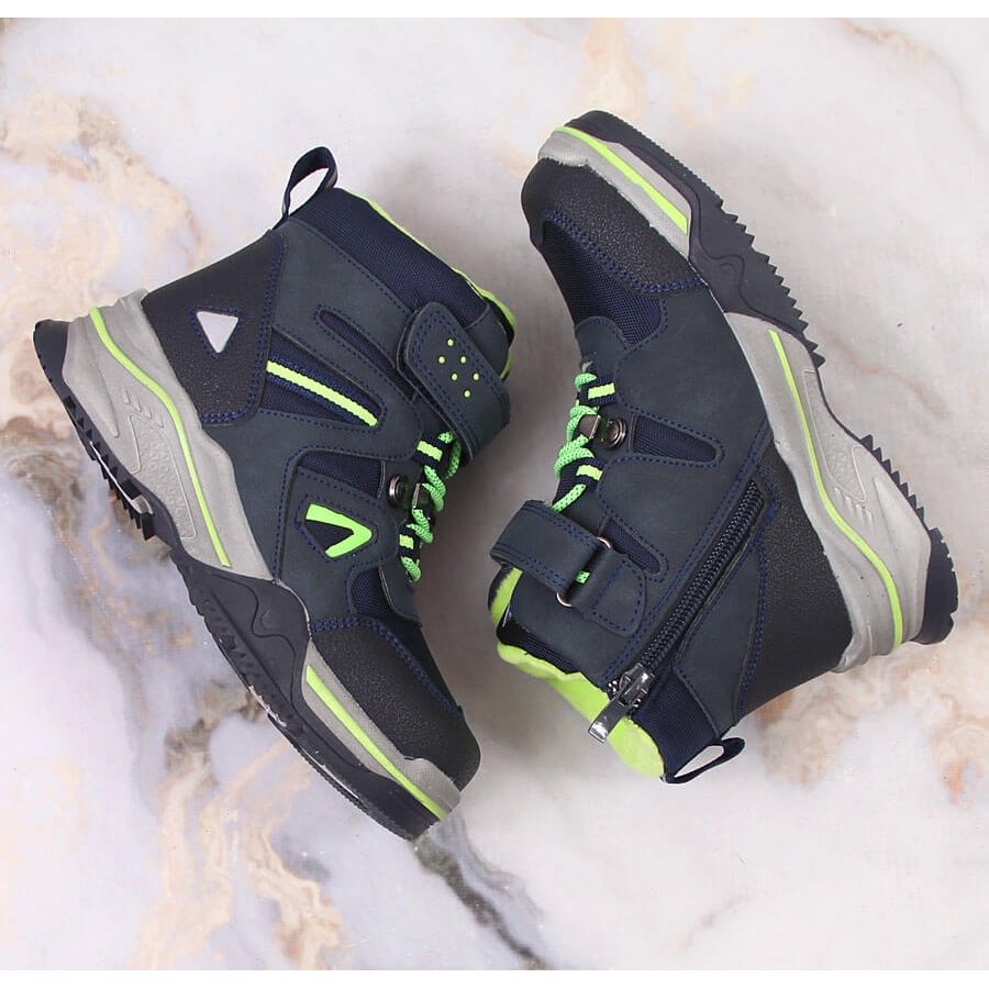 Los zapatos están disponibles en un elegante color azul marino con detalles adicionales en tonos negro y verde. El acabado de cuero ecológico los hace no solo modernos, sino también respetuosos con el medio ambiente. El interior del zapato está forrado de lana, lo que garantiza calidez y comodidad, incluso en los días más helados.