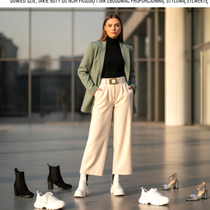 No todos los zapatos quedarán bien con pantalones anchos. Las bailarinas con suela plana y perneras largas y anchas son una combinación que puede acortar ópticamente la silueta, a menos que los pantalones se acorten adecuadamente hasta el tobillo. Lo mismo ocurre con las zapatillas bajas, que se pierden bajo las perneras largas de los pantalones, perturbando el efecto general.