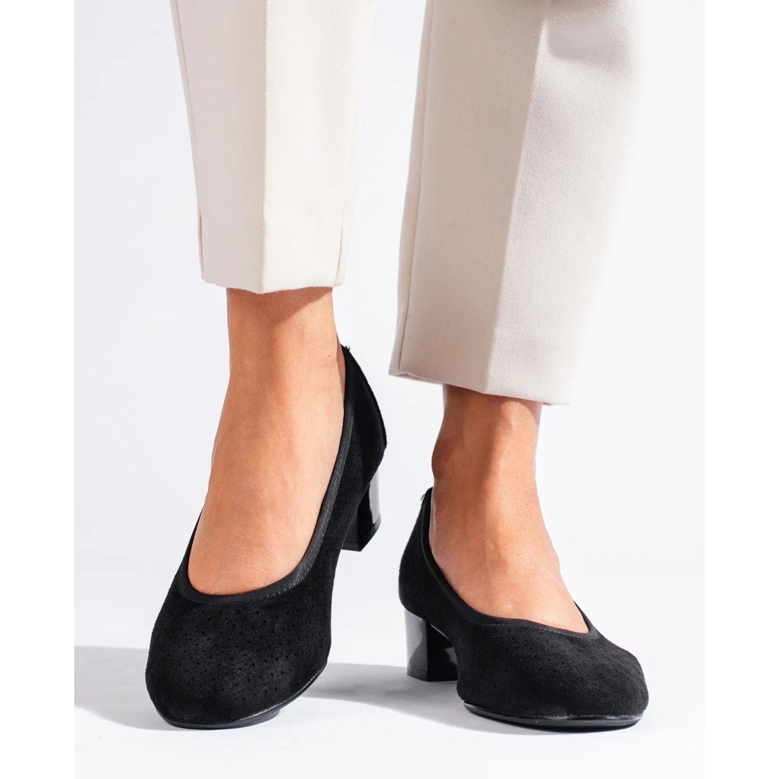 Producidos por la reconocida marca W. Potocki, estos zapatos de salón están destinados a mujeres que valoran el estilo clásico con un toque de originalidad. De color negro, confeccionados en ante ecológico de alta calidad, son una base excelente para muchos estilos. Su color universal y su diseño clásico los hacen combinar con la mayoría de conjuntos, desde jeans de uso diario hasta vestidos elegantes.