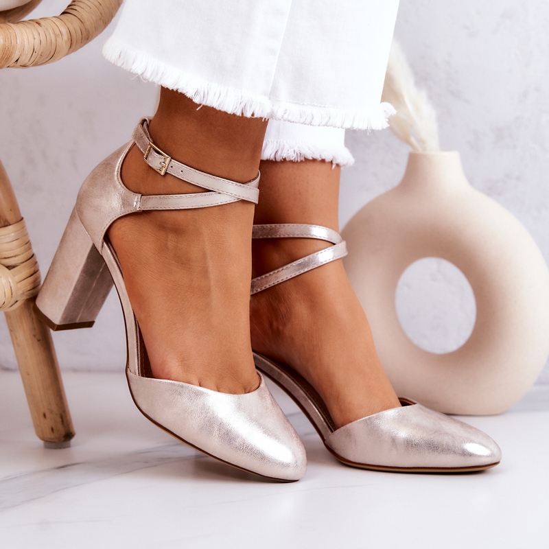 Descubre los extraordinarios zapatos de salón Sergio Leone SK851 de piel con tacón alto en un elegante color dorado, que complementarán a la perfección el estilismo de cualquier mujer. Confeccionados en piel ecológica de la más alta calidad, combinan estilo y comodidad de uso. El cierre de hebilla con correa ajustable garantiza un perfecto ajuste al pie, y la suave plantilla de piel natural hace que tus pies se sientan cómodos incluso después de largas horas de caminata.