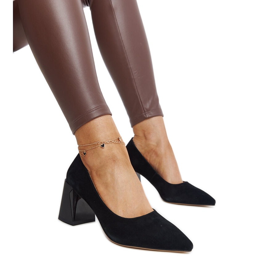 Las bombas están hechas de cuero de gamuza natural de alta calidad, que se ajusta perfectamente a las últimas tendencias. Los colores negros clásicos hacen que coincidan con muchos estilos, desde elegantes vestidos hasta sets informales con jeans. Además, el inserto de cuero garantiza la comodidad todo el día, y una suela de plástico sólido asegura la durabilidad y la buena adhesión.