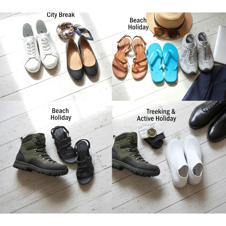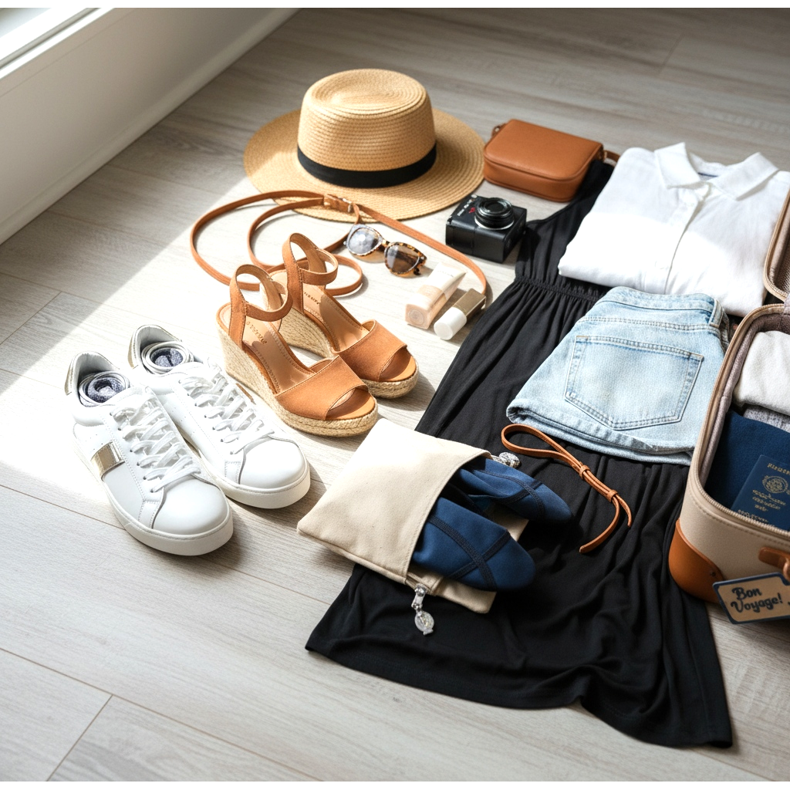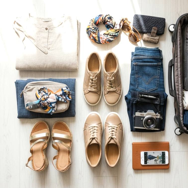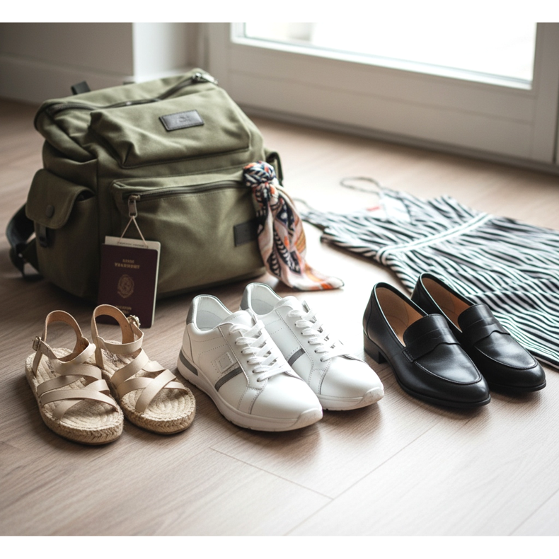 Una fórmula probada para cada viaje es la regla de los tres pares: zapatos cómodos para hacer turismo, zapatos elegantes para salir y calzado de playa o deportivo, según la naturaleza del viaje. Esta combinación cubre prácticamente todas las situaciones, desde correr por la mañana hasta cenar.