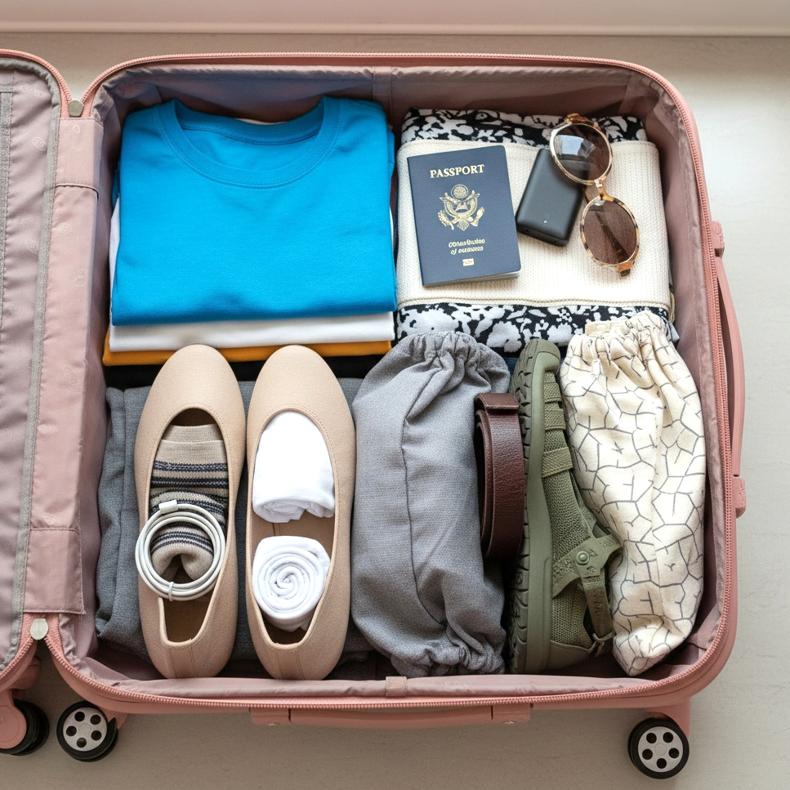 Utiliza el interior de tus zapatos para guardar objetos pequeños: calcetines, ropa interior, cargadores o un cinturón. Este es un truco clásico que ahorra una sorprendente cantidad de espacio. Coloca tus zapatos en el fondo de la maleta, con las suelas contra la pared; crean una base estable para el resto de tu ropa y no ensucian tu guardarropa.