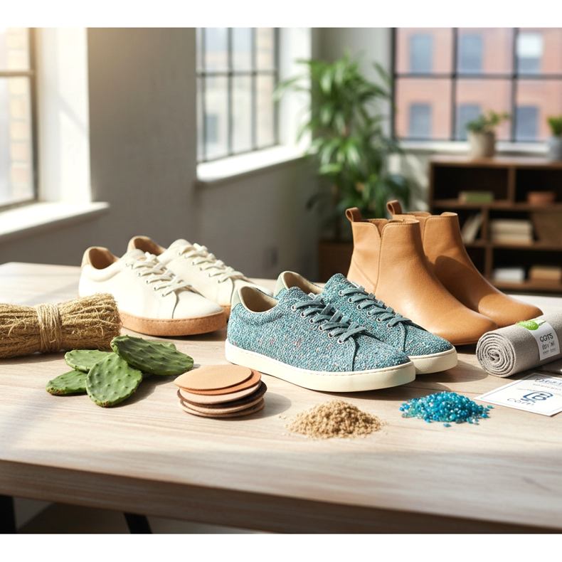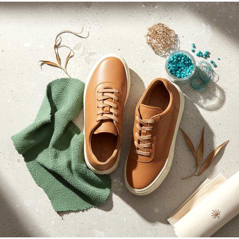 En la práctica, los zapatos ecológicos pueden estar hechos de materiales orgánicos (algodón orgánico, lino, cáñamo), materiales reciclados (botellas de PET recicladas, neumáticos viejos, desechos marinos) o sustitutos innovadores del cuero (cuero de setas, piña, cactus). Las suelas suelen estar hechas de caucho natural o caucho reciclado.