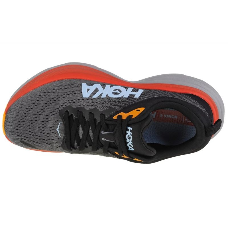 El modelo Hoka Bondi 8 en un elegante color gris con acentos negros se ve extremadamente elegante. El logotipo del fabricante complementa el todo, enfatizando la alta calidad de la marca Hoka.