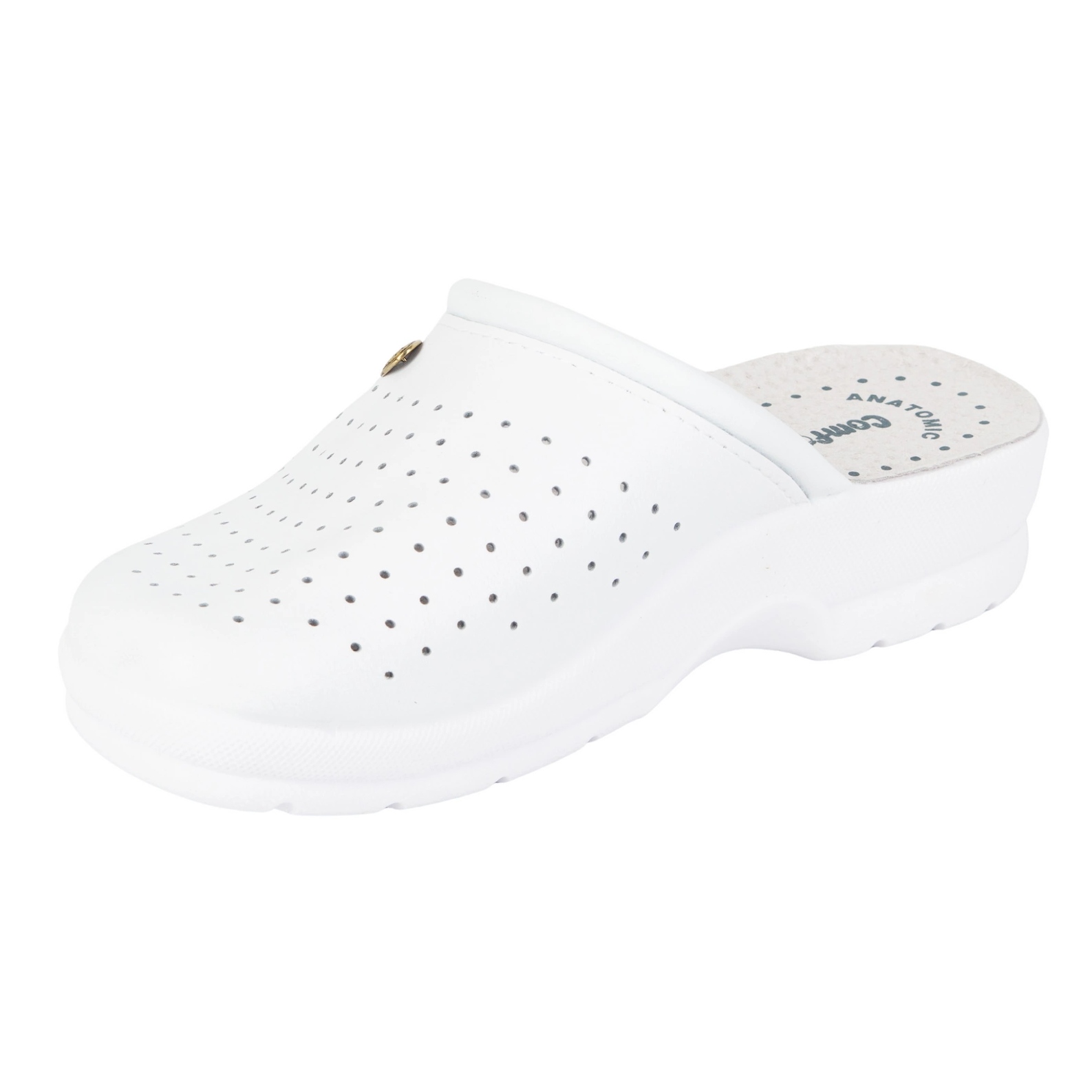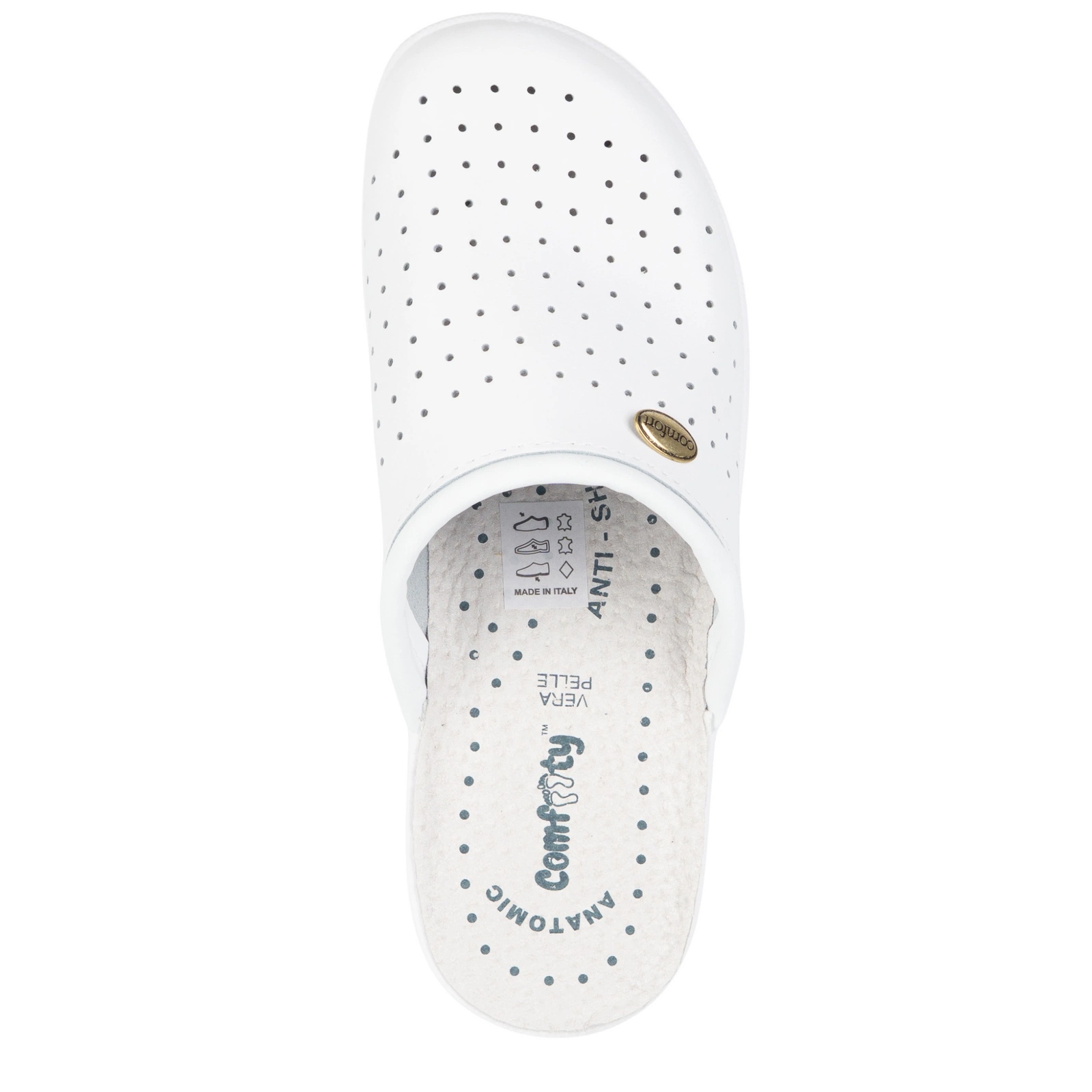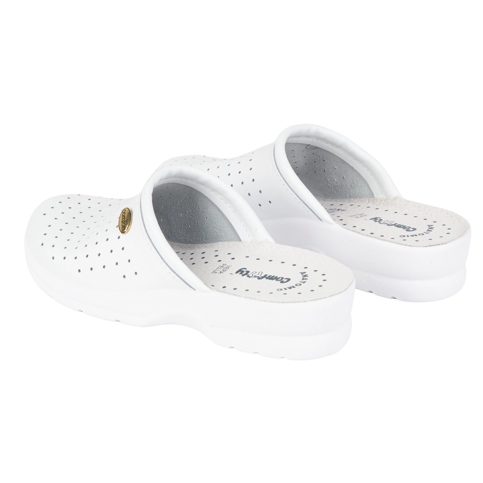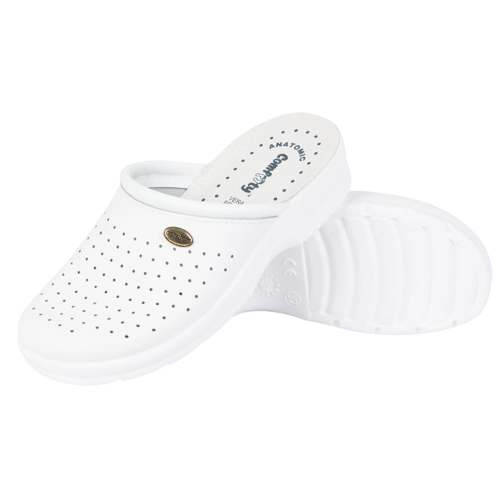 Las obras de cuero para mujeres de Comfoot son un modelo clásico creado para trabajar en condiciones exigentes. Su parte superior de cuero de grano construida está equipada con perforaciones delicadas que soportan la ventilación del pie durante el uso largo. La forma minimalista y los detalles sutiles de metal hacen que el modelo se ajuste a la estética del calzado profesional. El inserto está hecho de cuero natural con el sistema anti-Shock (inserto de cuero suave con una capa de gel), una suela ligera y elástica y perfiles anatómicos son características que cada persona que trabaja en las industrias médicas, farmacéuticas o de cosméticos. El calzado garantiza la comodidad, la facilidad de limpieza y la adaptación a su ritmo diario.