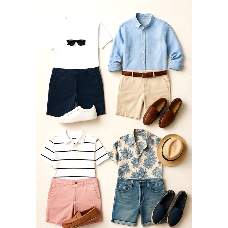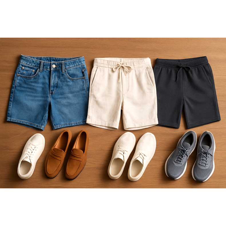 Pantalones cortos oscuros (azul marino, caqui) → zapatos claros (zapatillas blancas, mocasines color canela).