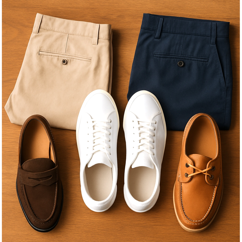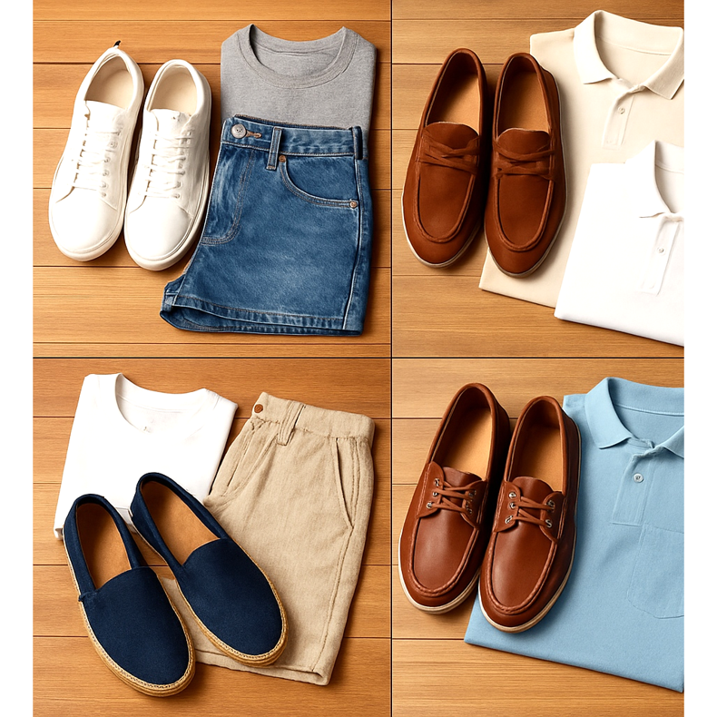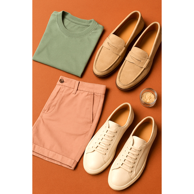 Pantalones cortos claros (beige, blanco) → zapatos más oscuros (azul marino, marrón).
