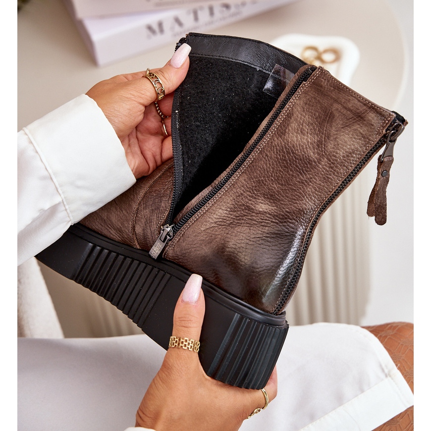 Hecho de cuero natural de alta calidad, las botas ofrecen no solo estilo sino también durabilidad. Una plataforma masiva con una cuña delicada (5.5 cm) agrega altura, al tiempo que garantiza la estabilidad y la conveniencia todos los días. El modelo está equipado con una cremallera en la parte superior de la parte superior, facilitando la colocación, y además el control deslizante trasero juega un papel decorativo, enriqueciendo el todo con un detalle interesante. El talón estable y rígido y el aislamiento sentido en el interior se preocupan por la comodidad térmica, que es extremadamente importante en los días más fríos.